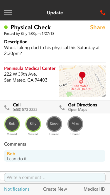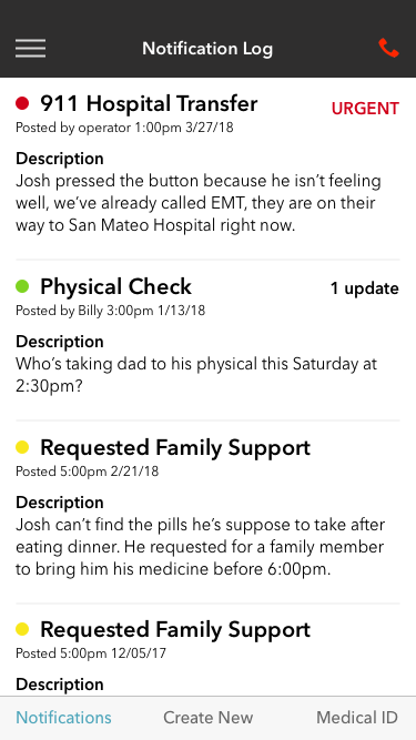 Our solution is a mobile app that allows family caregivers to receive real-time alerts from each other and Bay Alarm’s operators. It also serves as a repository for medical information and history. For users, this puts information at their fingertips and makes communication easier, all without making Bay Alarm operators liable for more information or drowning them in additional work.